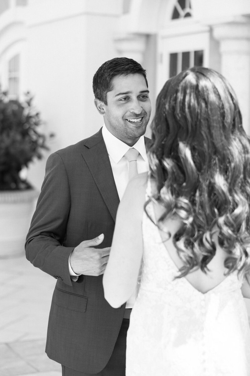 A first look opens up time prior to the ceremony for full bridal party pictures and, sometimes, for a few bride and groom portraits (although we prefer to do bride and groom portraits at sunset). This allows the couple to get the most out of cocktail hour, which makes the rest of the evening feel less rushed.